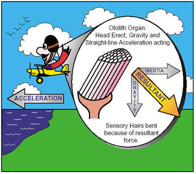 rearward direction. This causes the otolith organs to send the brain
