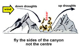 A similar thing happens when flying upslope terrain in a canyon. Your left arm become shorter and the airspeed decreases without you noticing it. When flying up a canyon, fly the UPDRAFT SIDE. If you can't gain altitude on one side, try the other side (Mother Nature may be fooling you about which side has the updraft).